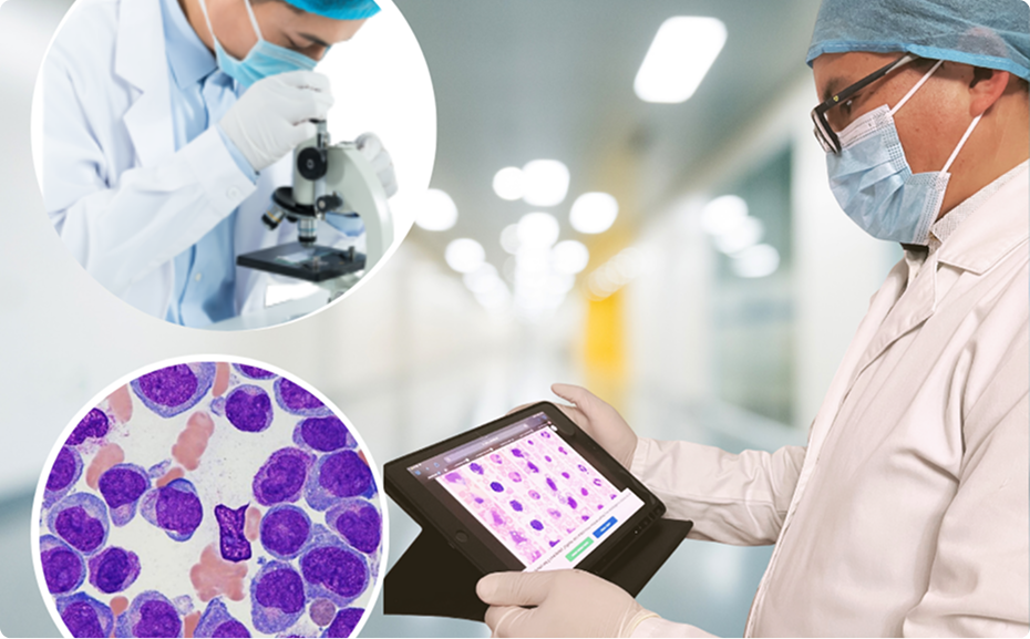 Un especialista analiza la lámina para detectar cualquier anormalidad en las células sanguíneas.